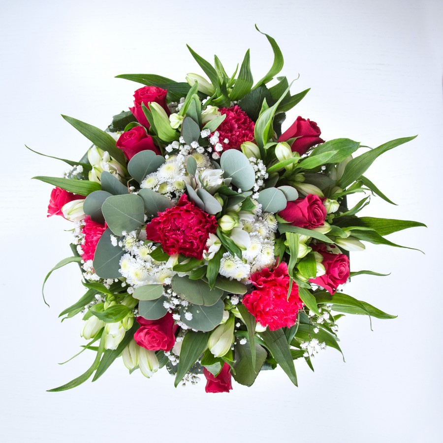 Immerse yourself in the elegance of our Timeless Floral Symphony. This sophisticated bouquet combines the passionate allure of red roses with the delicacy of white chrysanthemums and carnations, accented by the soft charm of gypsophila. The arrangement is further enriched by pristine white alstroemeria and verdant aspidistra leaves, creating a balanced and captivating design.